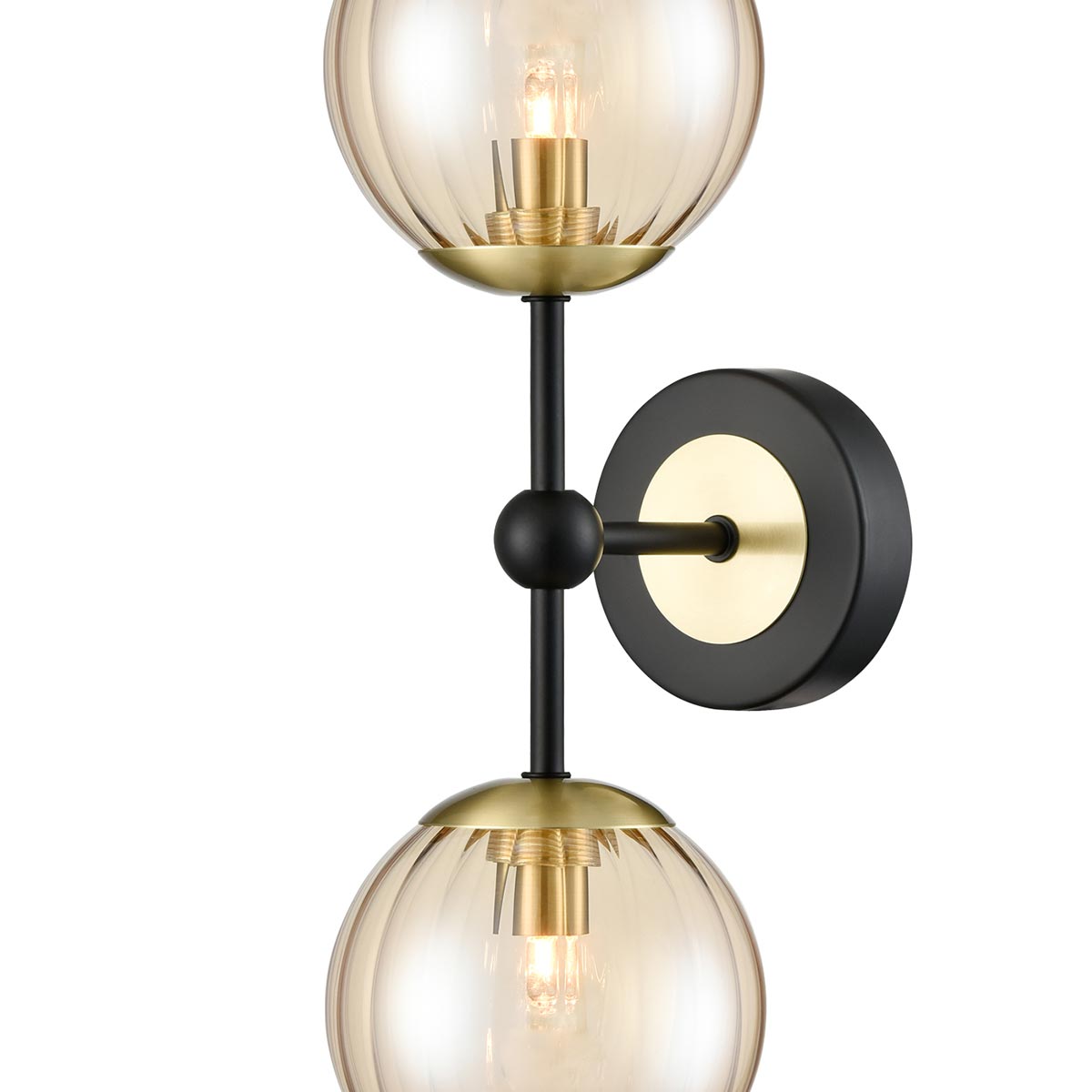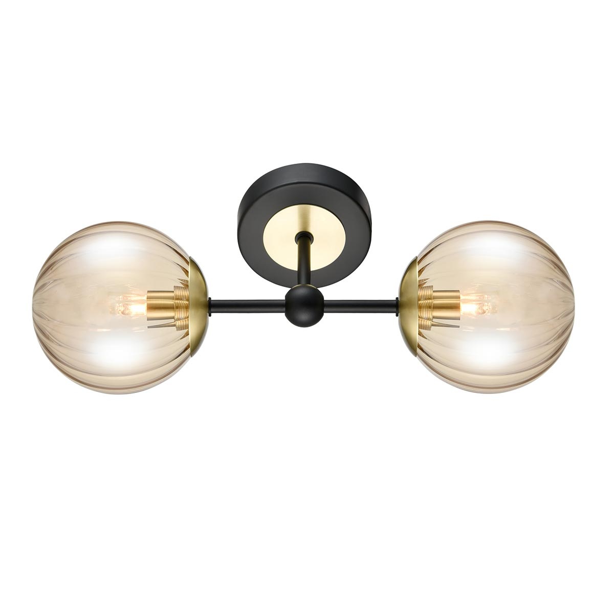 New for 2026, the Solar double wall light in matt black and satin brass with amber glass globe shades from Franklite. The Solar wall light features a circular mount and straight bar in matt black with satin brass details, with a ribbed amber glass globe shade is attached to each end. Can be mounted vertically or horizontally.