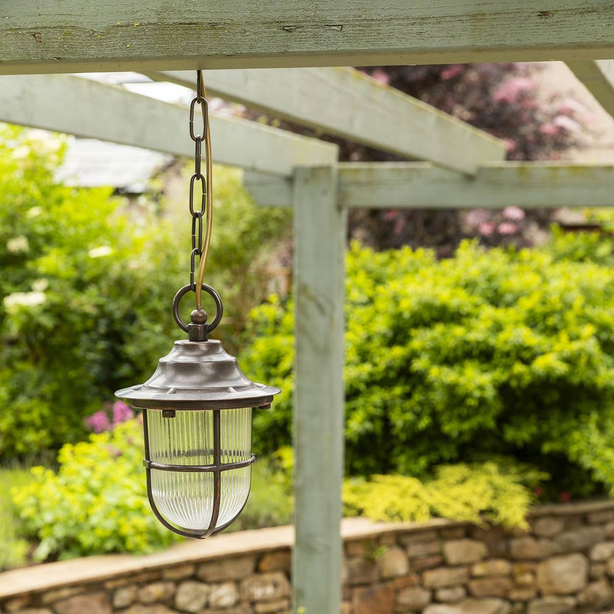 This solid antique brass porch chain lantern with guard is rated IP54 and features nautical style. Safe to use outdoors in all weathers, it is made from antique finish solid cast brass and ideal for use in severe weather coastal locations. Featuring a circular ceiling mount, height adjustable chain and downward facing ribbed pill glass shade with an outer protective guard.