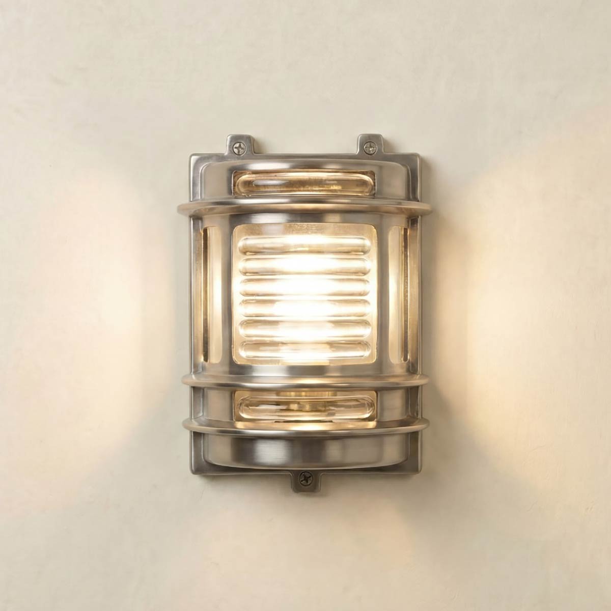 This solid brass nautical outdoor passage lantern in satin nickel is rated IP64 and features an Art Deco vibe. Safe to use outdoors in all weathers, it is made from unpolished nickel plated solid cast brass and ideal for use in severe weather coastal locations. Featuring a flush rectangular wall mount and rounded profile, with a heavy prismatic glass shade and protective castings.