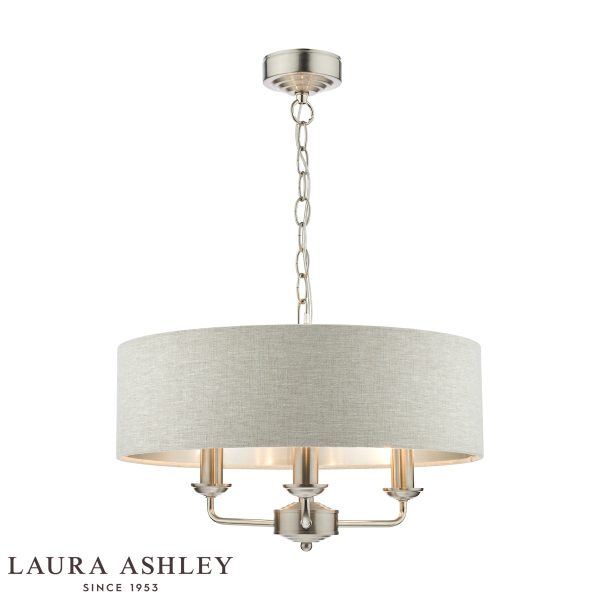 The Sorrento 3 light chandelier in satin nickel with natural linen shade by Laura Ashley is stylish and chic. Three candle style lights are surrounded by a contemporary natural linen shade with a metallic silver lined inner. The natural linen and satin nickel plated finish combine to create a sophisticated atmosphere to your living or dining areas.