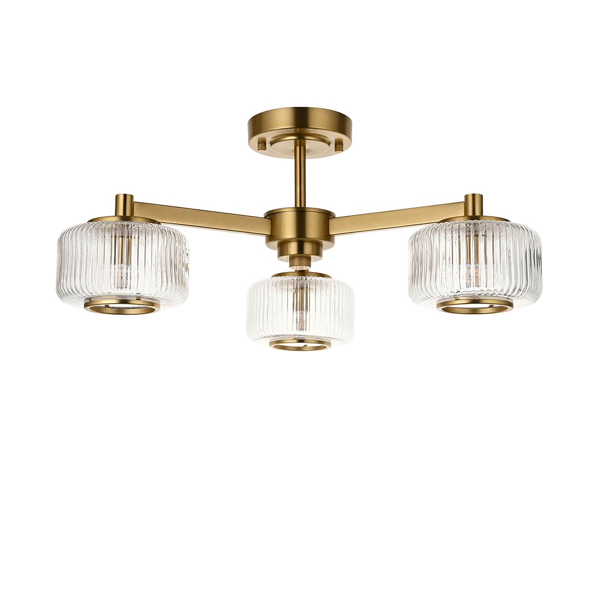 The Stamford 3 light semi flush ceiling light in brushed aged brass with clear ribbed glass drum shades blends mid 20th century style with contemporary flexibility. Featuring a circular ceiling mount, short drop rod and three straight aged brass plated arms. Three ribbed clear glass drum shades with metal trims hang below and create a twinkling light.
