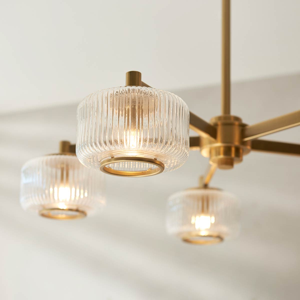The Stamford 5 light pendant in brushed aged brass with clear ribbed glass drum shades blends mid 20th century style with contemporary flexibility. Featuring a circular ceiling mount, central telescopic drop rod and five aged brass plated straight arms. Five ribbed clear glass drum shades with metal trims hang below and create a twinkling light.