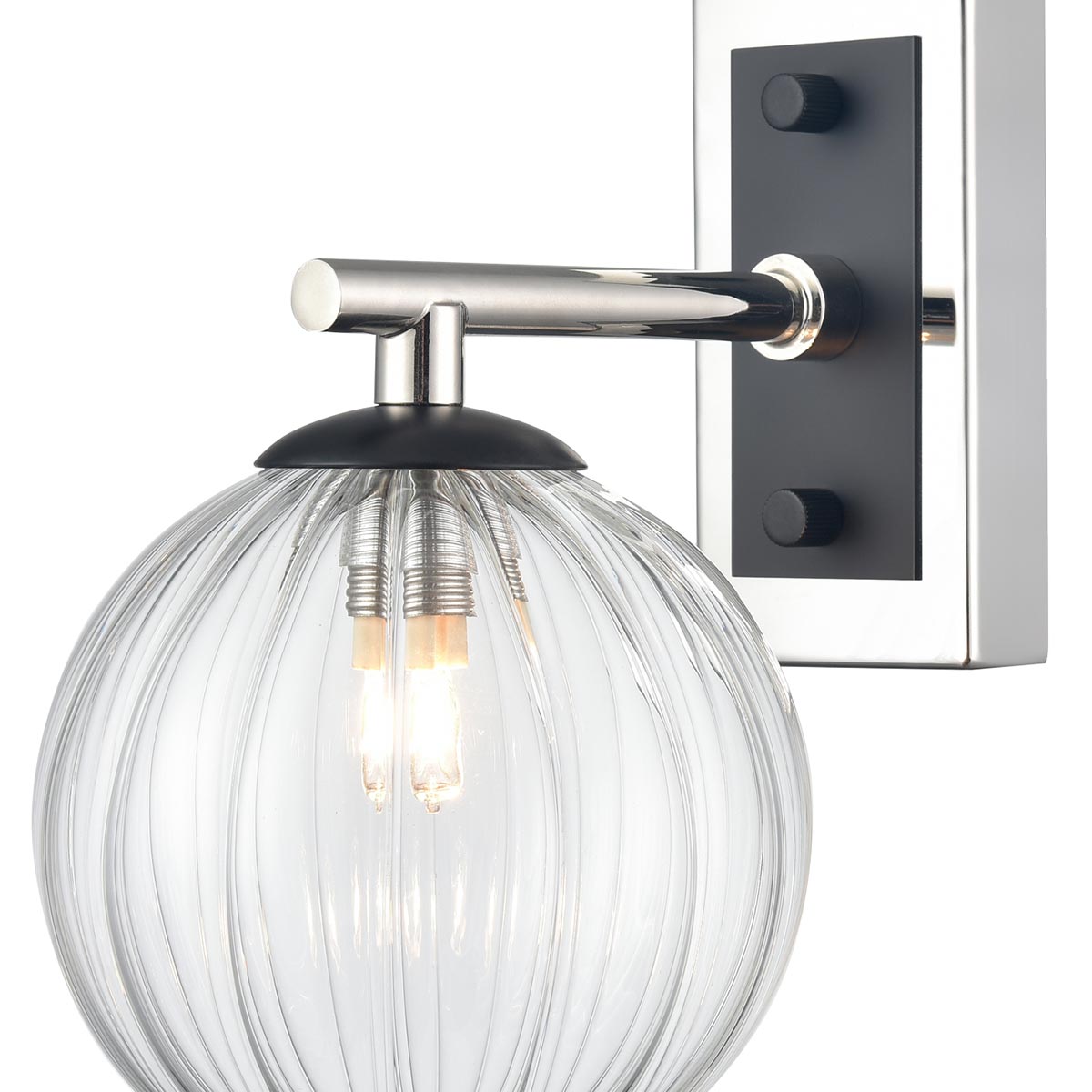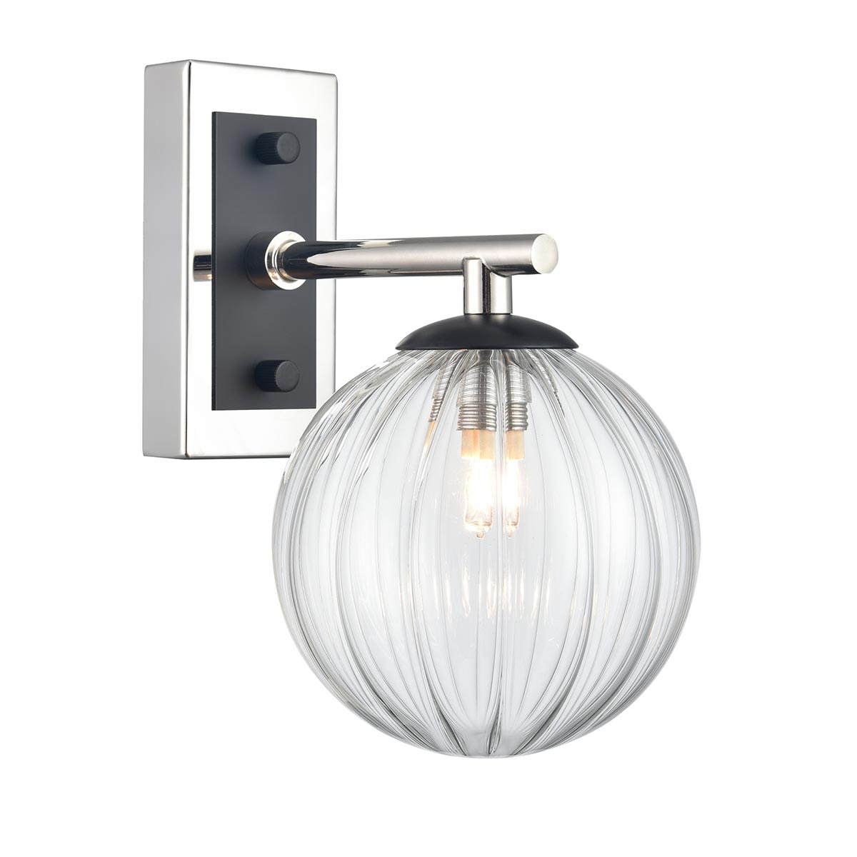 New for 2026, the Stellar single wall light in matt black and polished nickel with ribbed clear glass globe shade and rated IP44 from Franklite. A modern design, featuring a rectangular wall mount and straight arm in bright nickel with matt black detail. A ribbed clear glass globe shade hangs below, creating a diffused twinkling light.