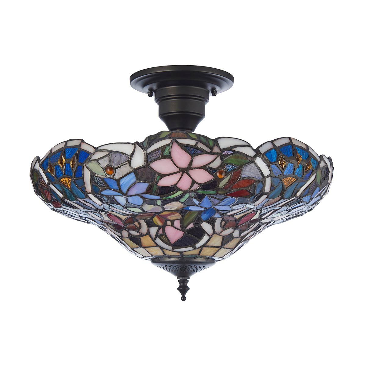 The Sullivan Tiffany 3 light semi flush ceiling light is handcrafted, and the colours may vary slightly from the images shown, as each piece of glass is hand-made and may differ slightly in colour or shade. This should not be seen as a fault, rather something that makes each Tiffany shade unique.