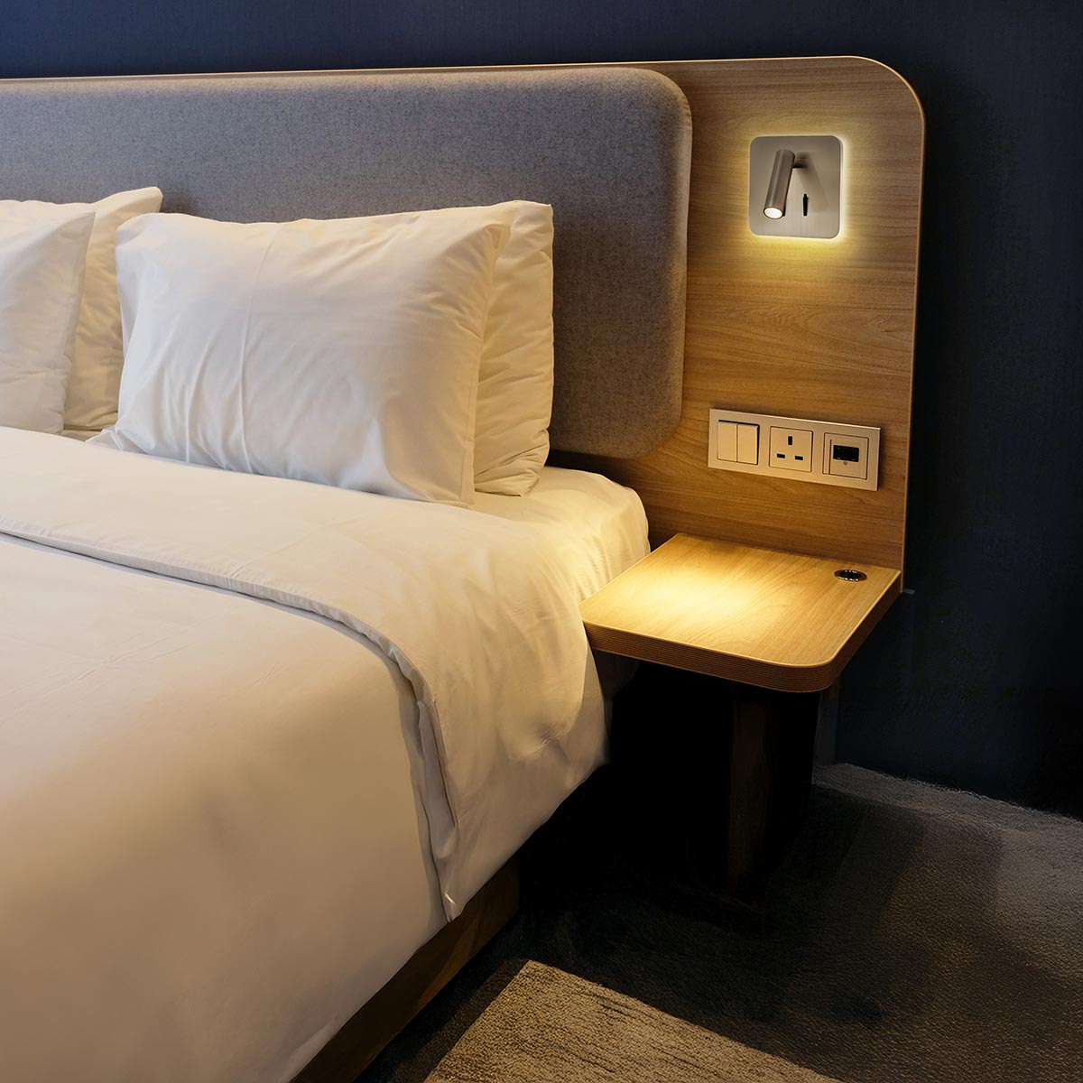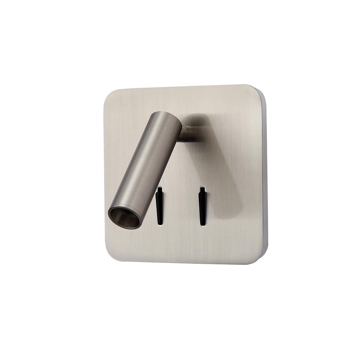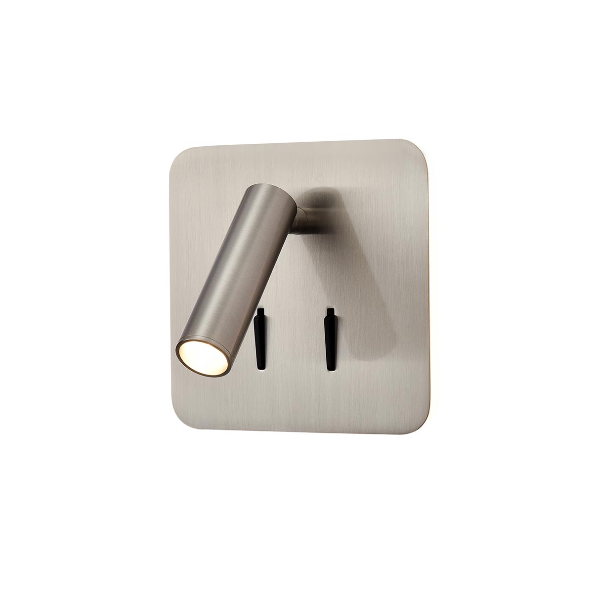 This switched LED square backlit bedside wall reading light in satin nickel by Franklite is contemporary and stylish. Featuring a square satin nickel wall mount with dual integral on / off rocker switches. The wall mount features rounder corners, a 9W back-light and a 3W adjustable directional reading light mounted on the faceplate.