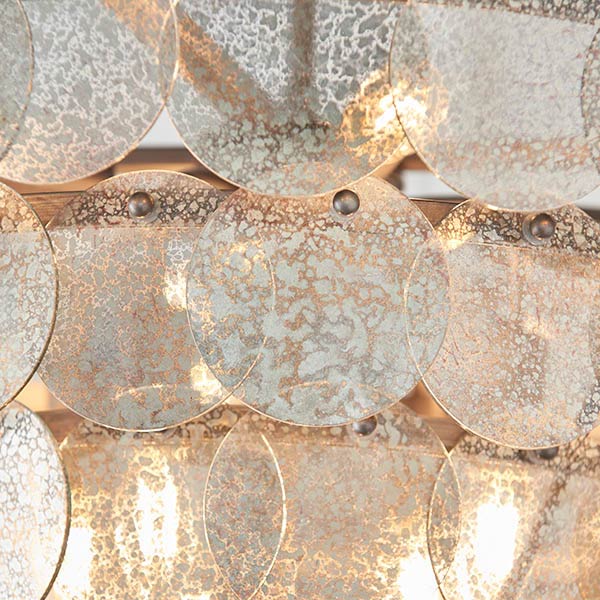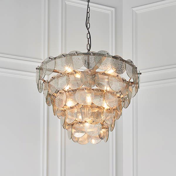 Create refined luxurious style in your home with this tiered 9 light mercury glass pendant in painted antique silver. Featuring a circular ceiling mount, chain suspension and tiered 63.5cm diameter metalwork frame with tiered layers of handmade mercury glass discs surrounding nine bulbs. Light passes through the discs, creating a wonderful mottled light.