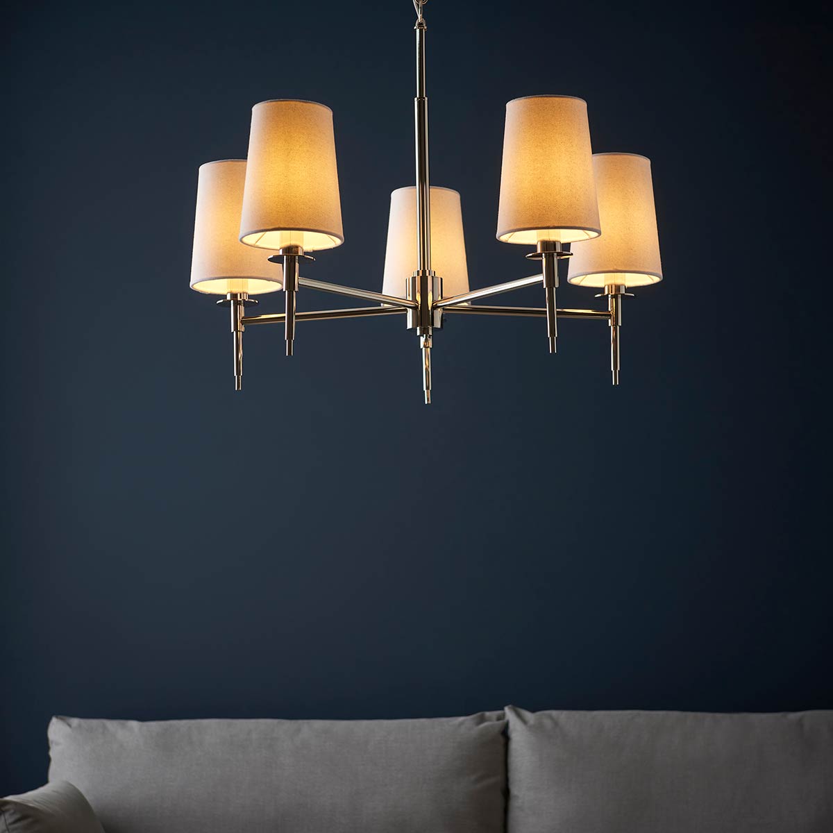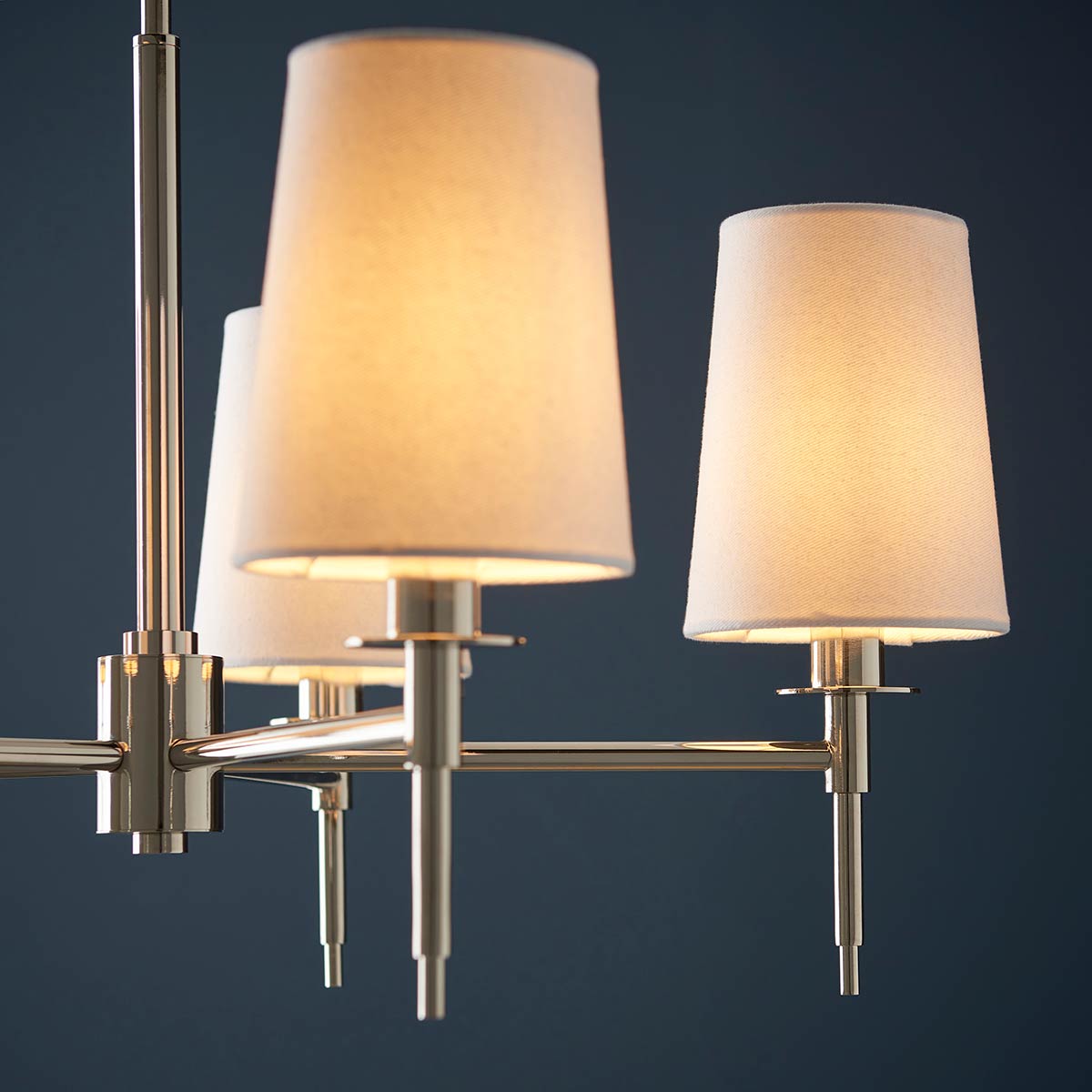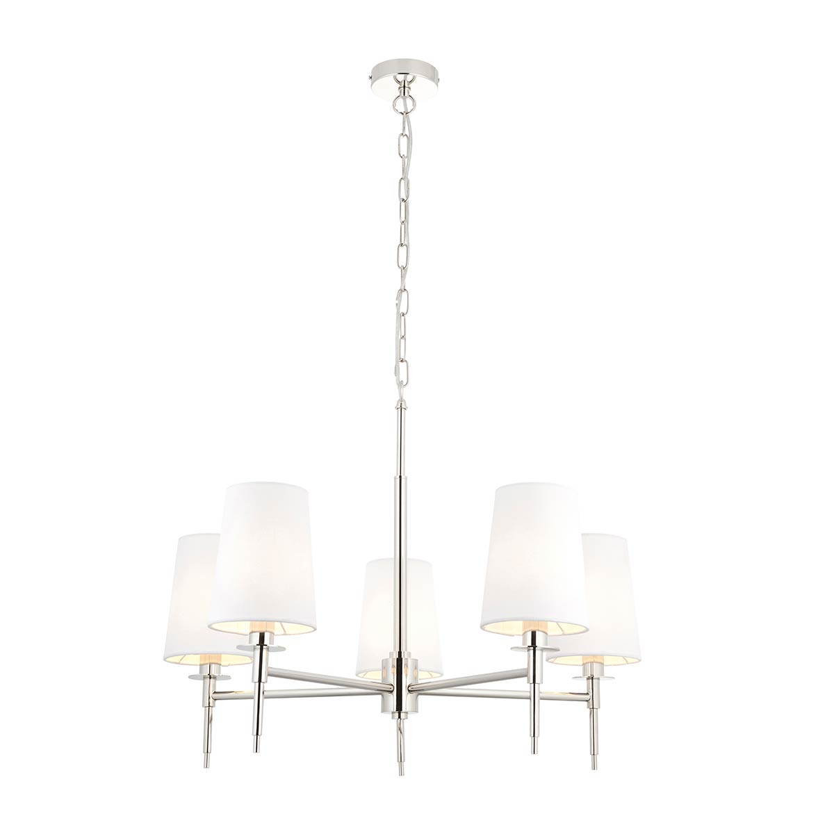Sleek and elegant, this traditional 5 light chandelier in polished nickel with vintage white shades boasts classic style with a contemporary edge. Featuring a circular ceiling mount, chain suspension and 69cm diameter frame plated in bright nickel. The five arms feature candlestick style holders, with candle drips and tapered vintage white fabric shades.