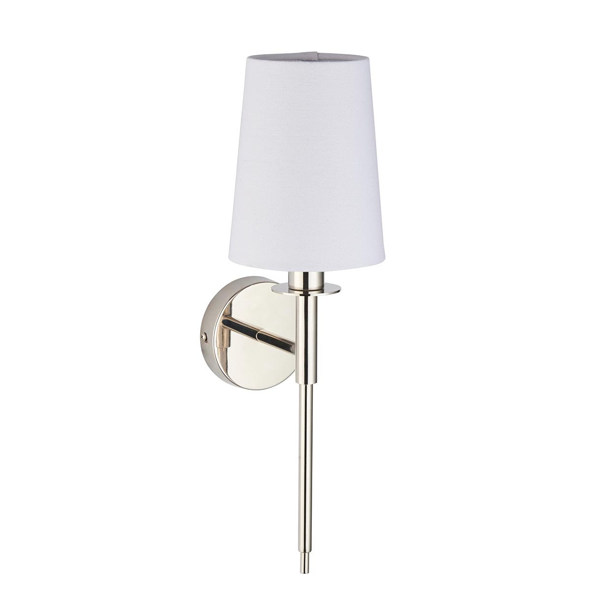 Sleek and elegant, this traditional single wall light in polished nickel with vintage white shade boasts classic style with a contemporary edge. Featuring circular wall mount, short support and slender candlestick arm with candle drip. Supplied with a 13cm diameter tapered vintage white cotton mix fabric lamp shade for a soft light.