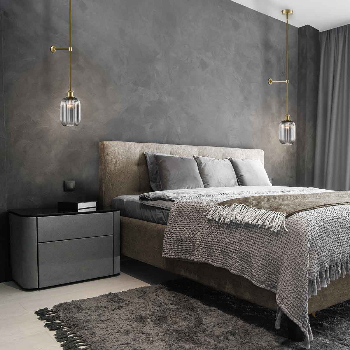 The Tranquil single light aged brass pendant with smoked ribbed glass shade from Franklite is spectacular. It features quality construction and features a circular ceiling mount, sectional rod suspension with a wall mounted brace and smoked ribbed glass cylinder shade. Light passes through the smoked glass, creating a bright, glare free atmosphere.