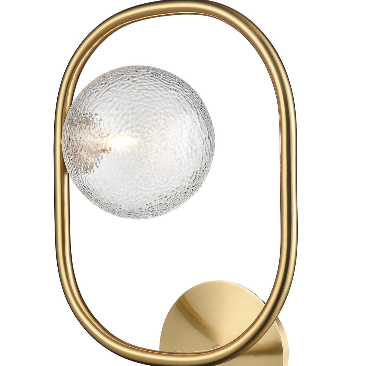 Introducing the Trapeze modern 1 light aged brass single wall light with clear speckled glass globe shades from Franklite. Featuring a circular wall mount and upright aged brass hoop, with a speckled glass globe shade snuggled inside the hoop, creating a lovely twinkling light.