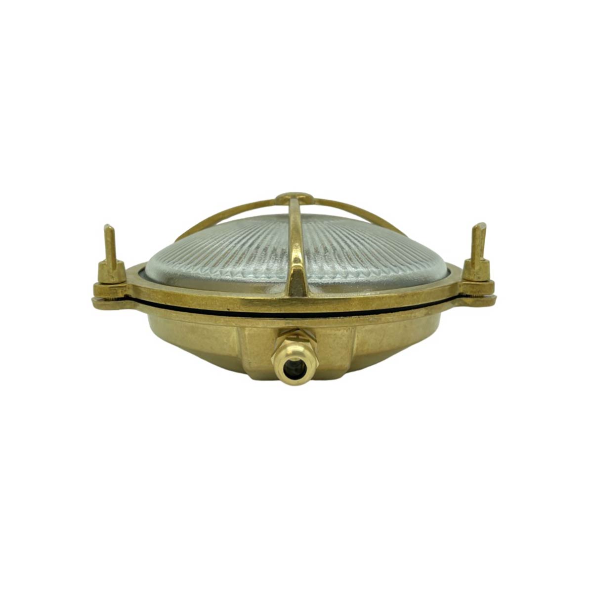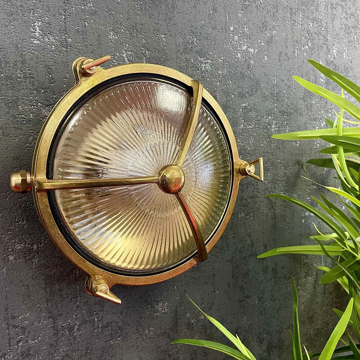 This Trident nautical bulkhead light in solid raw brass is rated IP64 and features classic style. Safe to use outdoors in all weathers, it is made from solid cast brass left in its natural raw state and ideal for use in severe weather coastal locations. Featuring a circular 21cm diameter body, with domed clear ribbed glass shade and three protective bars.