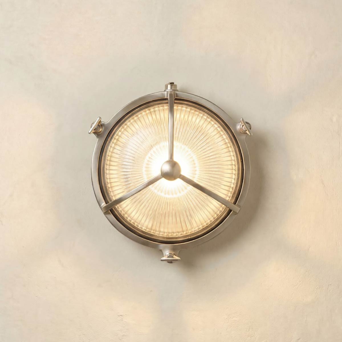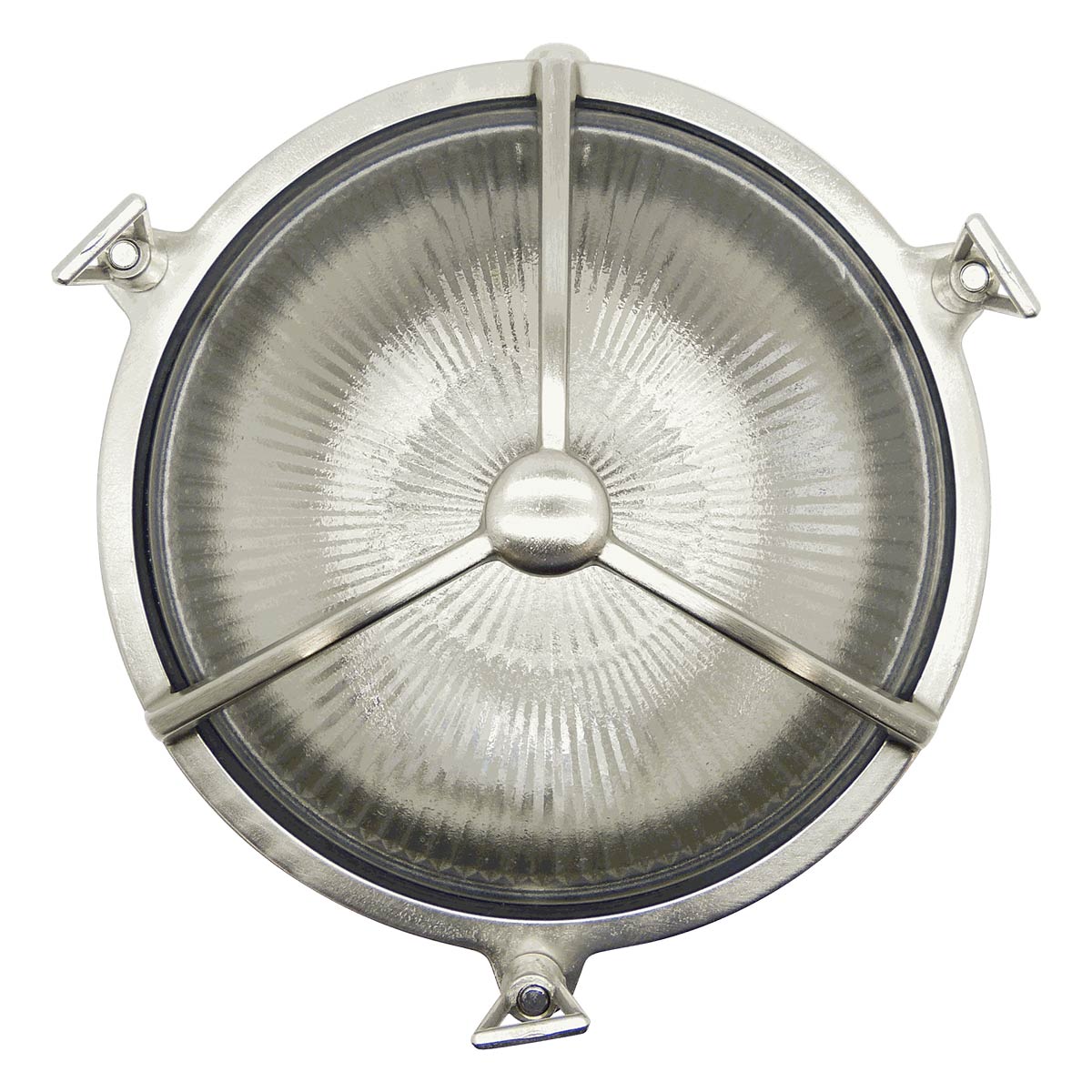 This Trident solid brass nautical bulkhead light in satin nickel finish is rated IP64 and features classic style. Safe to use outdoors in all weathers, it is made from satin nickel plated solid cast brass and ideal for use in severe weather coastal locations. Featuring a circular 21cm diameter body, with domed clear ribbed glass shade and three protective bars.