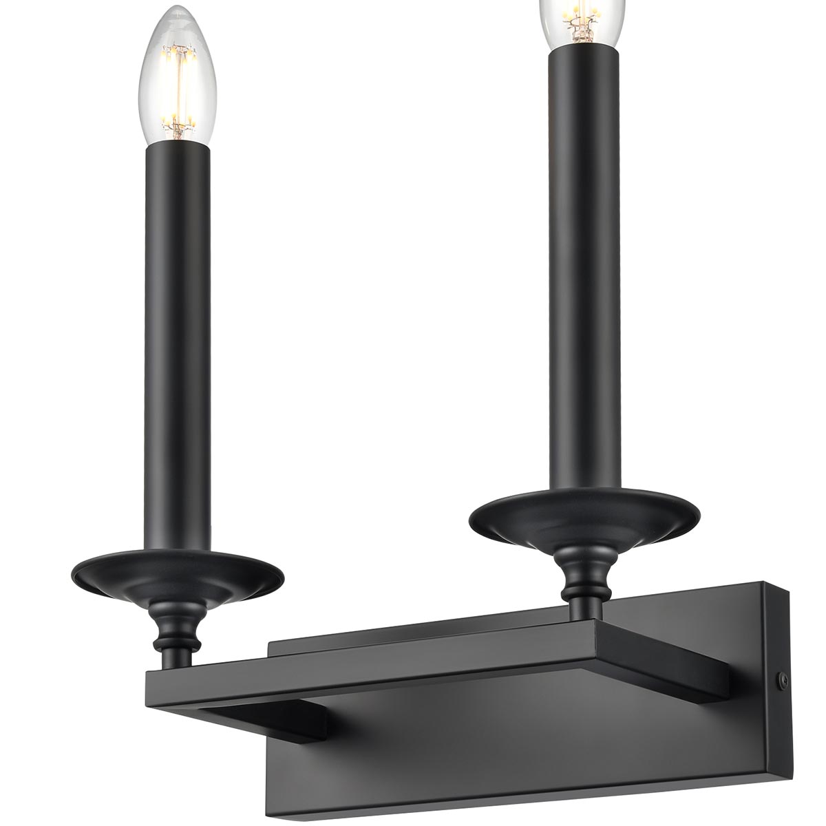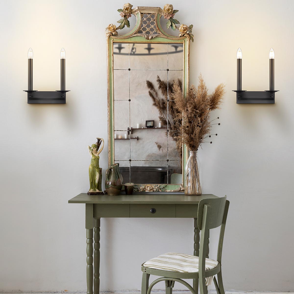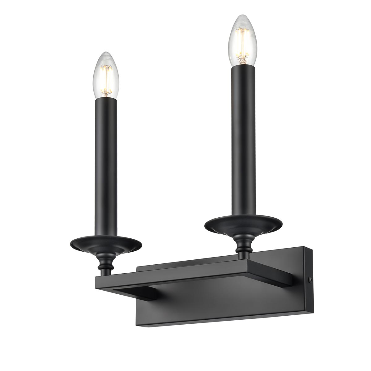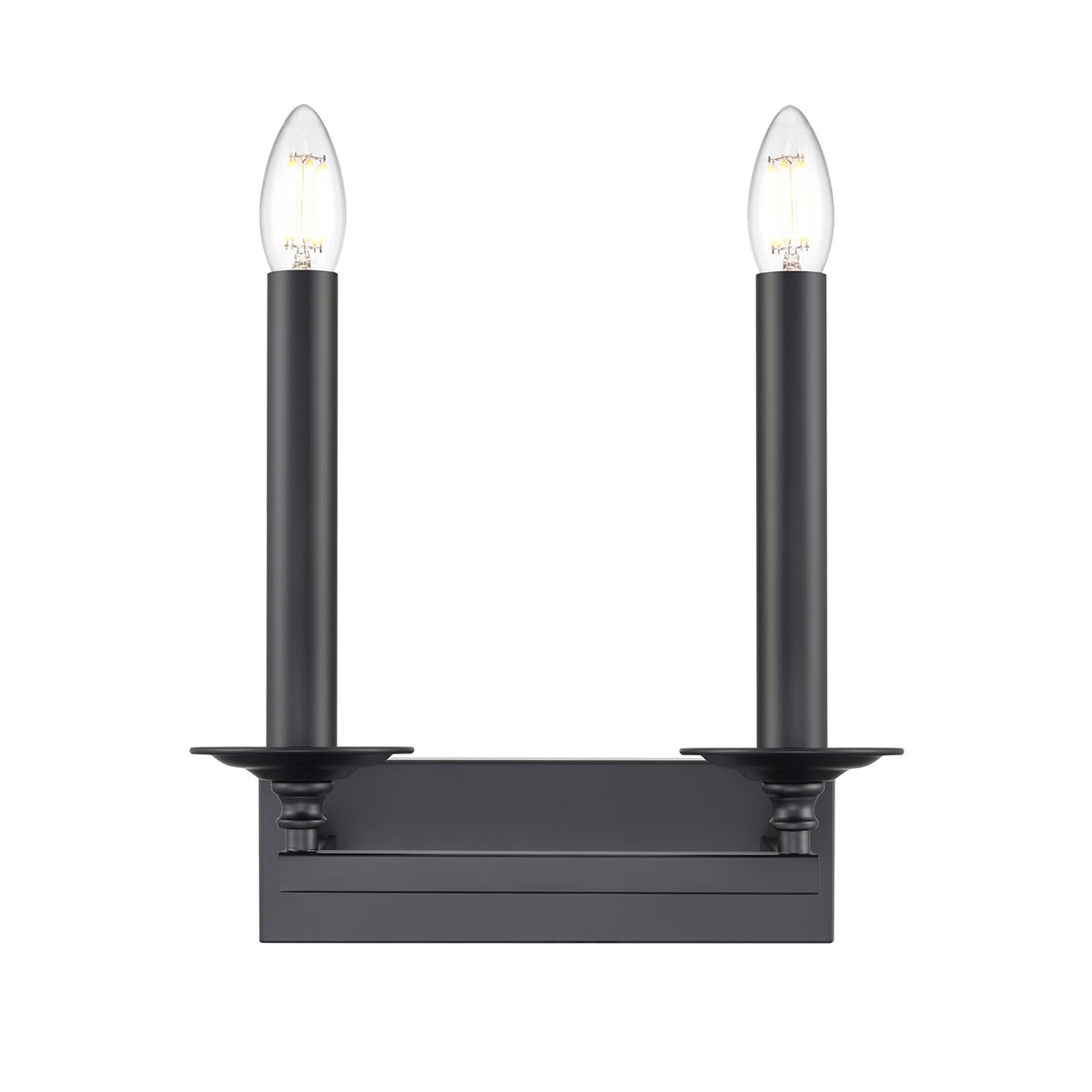 The Tudor 2 light matt black twin wall light from Franklite features a contemporary take on the traditional ironwork design. Featuring a wide rectangular wall mount and protruding square bar frame, with a pair of tall candle style lights sitting on top. Each light boasts a tall matt black candle tube and metal candle pan.