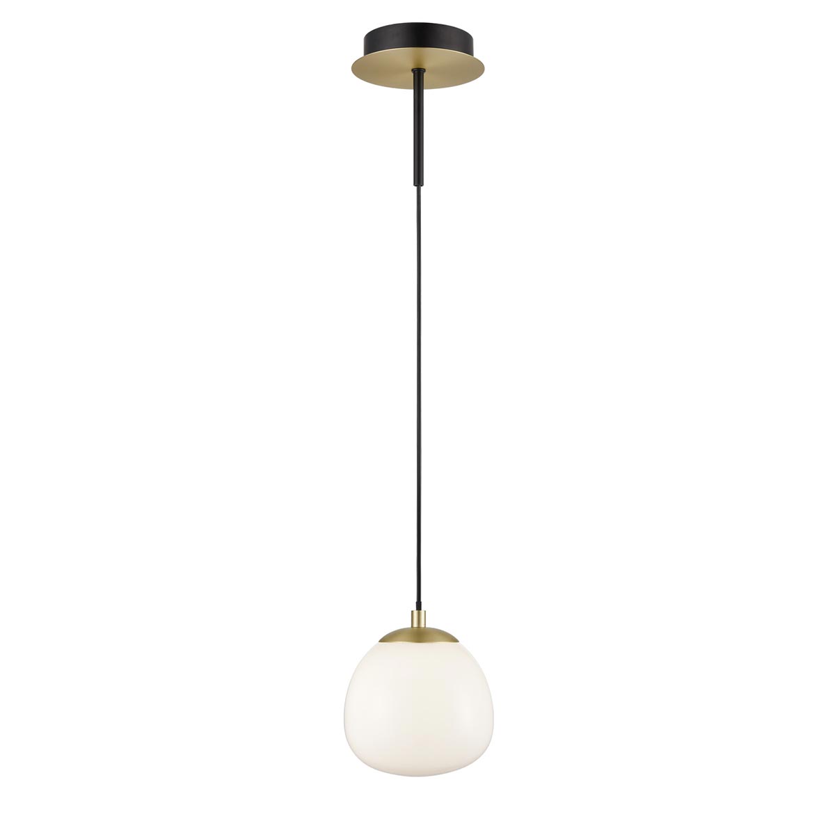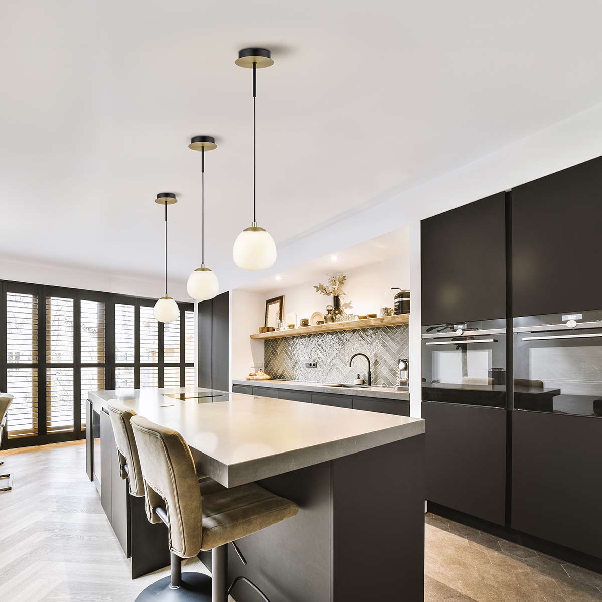 New for 2026, the Vermeer pendant or wall light in matt black and gold with opal glass shade is elegant and sophisticated. Featuring a circular mount and hollow tube in matt black with gold details. A black cable threads through the tube, with a suspended opal glass globe that creates a lovely soft light. A dual-purpose fitting that can be mounted on the ceiling or wall.