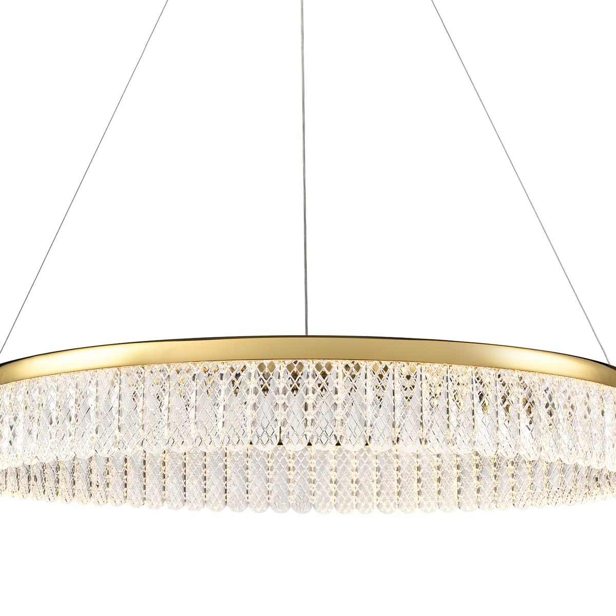 The Victoria LED large crystal pendant in gold with 80cm diameter and delicate lattice crystals from Franklite brings luxurious contemporary style to any room. A large circular frame hangs by fine wires from a gold finish ceiling mount, surrounded by a deep lattice crystal fringe to create a wonderful sparkle.