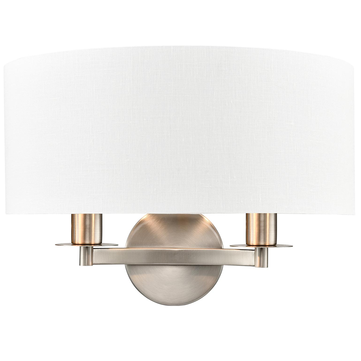 The Windsor switched satin nickel twin wall light with brushed silver inner cream textured fabric shade from Franklite is beautiful and contemporary. Featuring a circular wall mount, curved horizontal arm and two candle style lights in satin nickel. The candle style lights are surrounded by a half-round, silver lined textured cream fabric shade.
